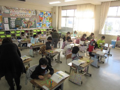 1時間目は算数の授業でした。数え棒をならべて色々な形を作りました。
