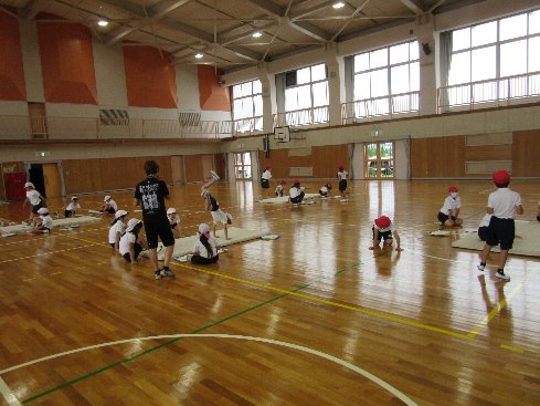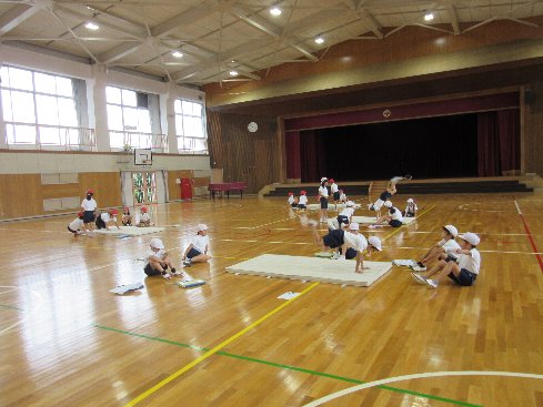 2時間目は体育の授業でした。ジャベボール投げをしたあと、マットで倒立前転をするための前段階の技の練習をしました。両手をついて足を振り上げ、おしりの後ろではい拍手。簡単そうで、なかなか難しかったようです。