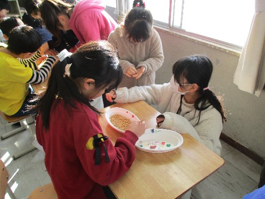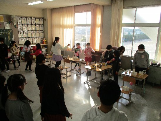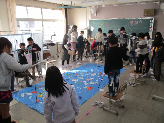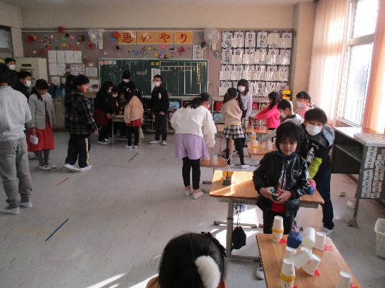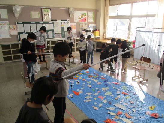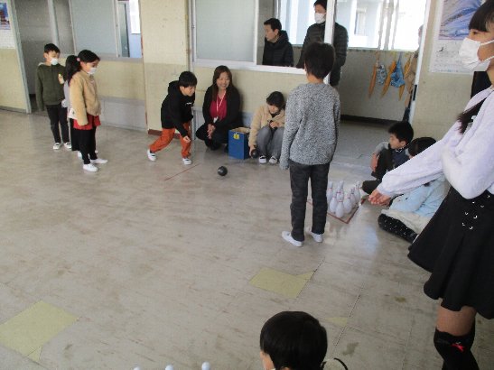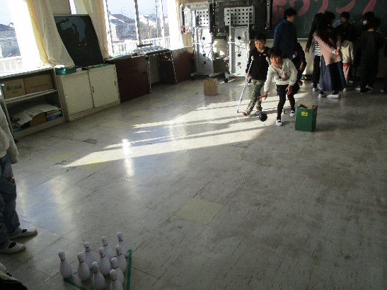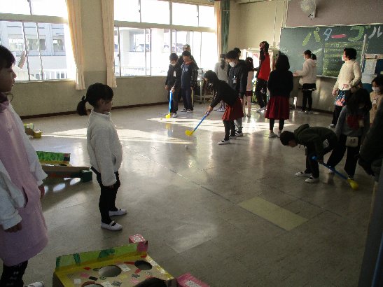 業前と1・2時間目を使ってウインターフェスティバルを行いました。5つの会場(魚釣り、パターゴルフ、ボーリング、豆つかみ、的あて)ぞれぞれのなかま班が交代で店番班と遊び班の担当をして楽しむという形です。たくさんの保護者の方の参観もあり、賑やかなフェスティバルになりました。