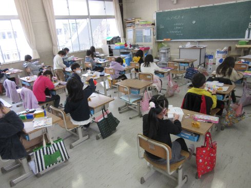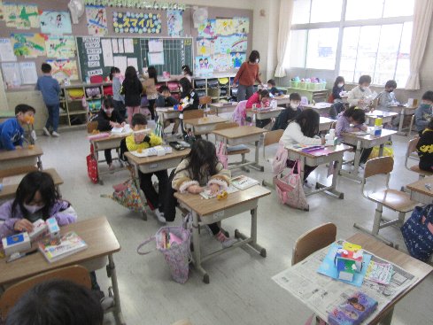 3時間目は図画工作の授業でした。「はこでつくったよ」の展示用紹介カードを書きました。