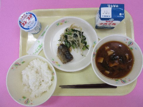 ご飯、牛乳、秋刀魚のみぞれ煮、小松菜のお浸し、アサリの味噌汁、ヨーグルト