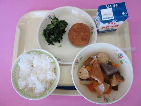 ご飯、牛乳、キャベツ入りメンチカツ、関東煮、磯香和え