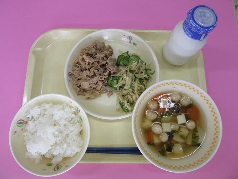 冷やし肉うどん(冷やしうどん、めんつゆ)、牛乳、枝豆コロッケ、もやしの和風サラダ