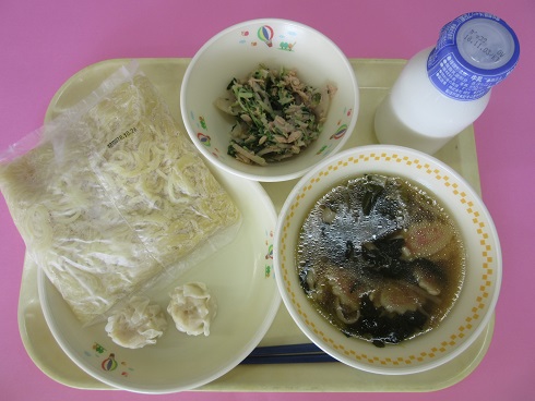 ご飯、牛乳、ビビンバ(豚肉炒め・ナムル)、ワンタンスープ