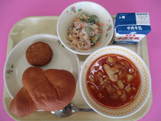 クロスロールパン、牛乳、メンチカツ、ポークビーンズ、マカロニサラダ