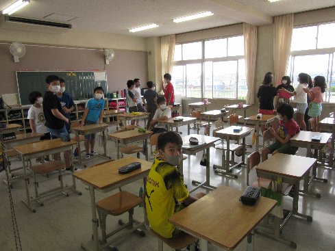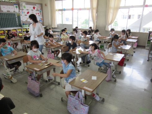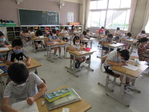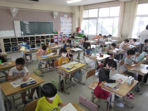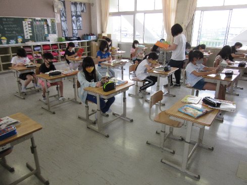 業前は、担任の先生の計画による学習の時間です。漢字ドリルや計算に取り組んでいました。早く終わったクラスは、係を決めていました。