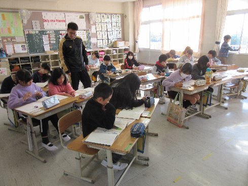 1時間目は国語の授業でした。「プラタナスの木」から学んだ自然の強さについて、自分が感じたことを作文に書きました。