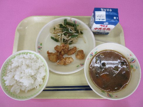 ご飯、牛乳、揚げ鶏のレモンソース、いんげんの胡麻和え、豚汁