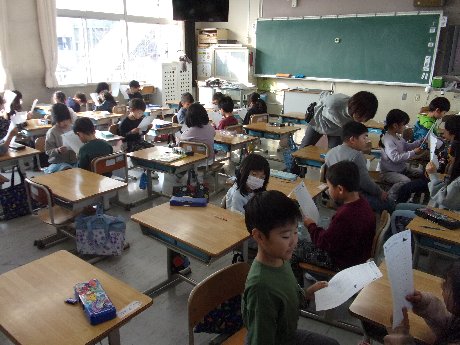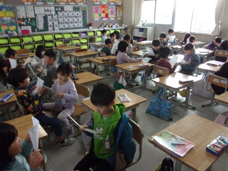 1時間目は算数の授業でした。暗算カードで二人ペアになって、暗唱しました。