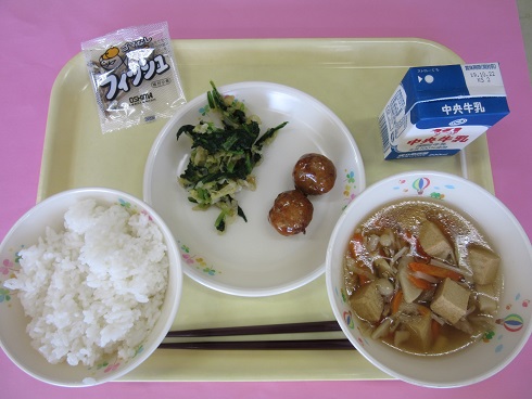ご飯、牛乳、つくね、小松菜の和え物、さわにわん、乾燥小魚