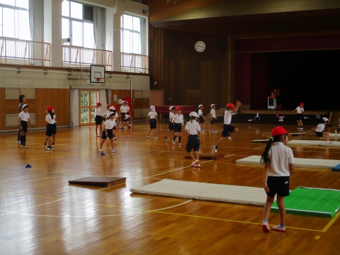 マットと踏み切板を使って走り幅跳びに取り組んでいました。助走の勢いを力強い踏み切りで高さに変えていました。