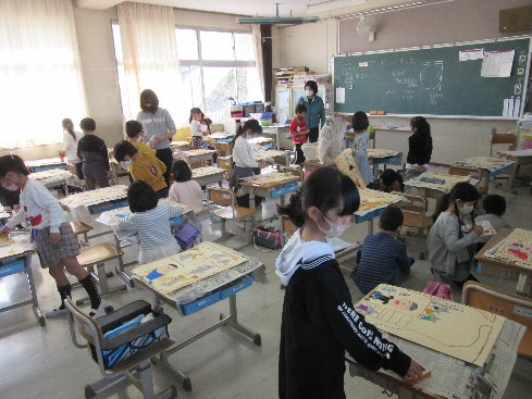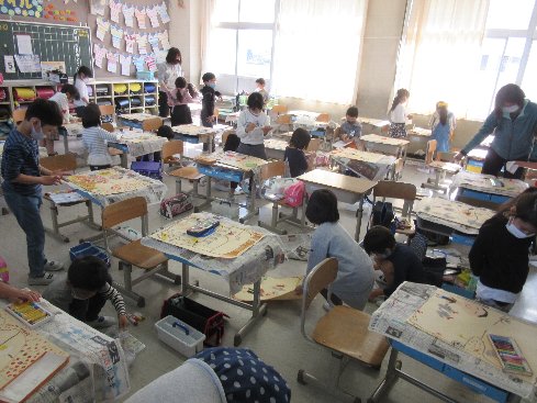 3時間目は図画工作の授業でした。「ものがたりのえ」の色塗りを進めました。