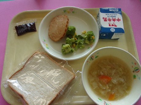 スライスパン、牛乳、ハムステーキ、ブロッコリーサラダ、アルファベットスープ、チョコクリーム