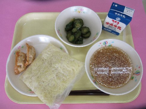 醤油ラーメン(中華麺)、牛乳、揚げ餃子、胡瓜の香り付け