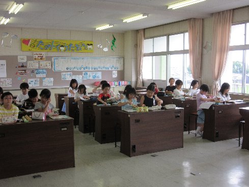 4時間目は音楽の授業でした。「いろんな木の実」という曲で、アルトリコーダーで演奏したり、いろいろな打楽器を演奏したりしました。