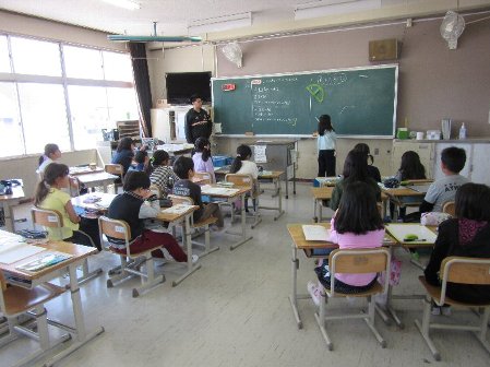 3時間目は算数の授業でした。「大きな角を工夫して測ろう」というテーマで、90度より大きい角をどうしたら測れるか考えました。