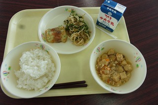 ご飯、牛乳、ちくわの磯辺揚げ、とうがんのそぼろ煮、
