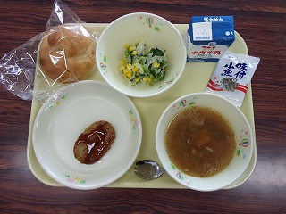 りんごパン、牛乳、ハンバーグ、コールスロー、オニオンスープ、