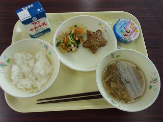 ご飯、牛乳、お星さまハンバーグ、天の川風和え物、七夕汁、