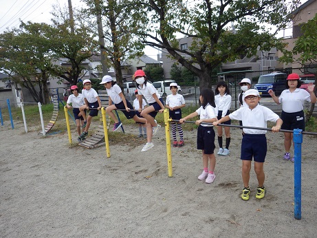 4月17日(火)3時間目は体育の授業でした。大きなかけ声をかけながら、運動場を走りました。その後、2人ペアになって、柔軟体操をしました。