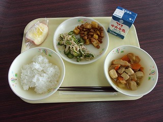 ご飯、牛乳、高野豆腐の煮物、大豆とサツマイモのあまからあげ