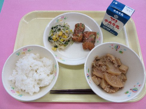 ご飯、牛乳、竹輪の磯辺揚げ、大根の旨煮、三つ葉の和え物