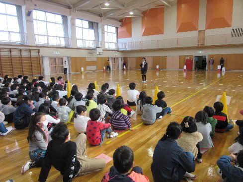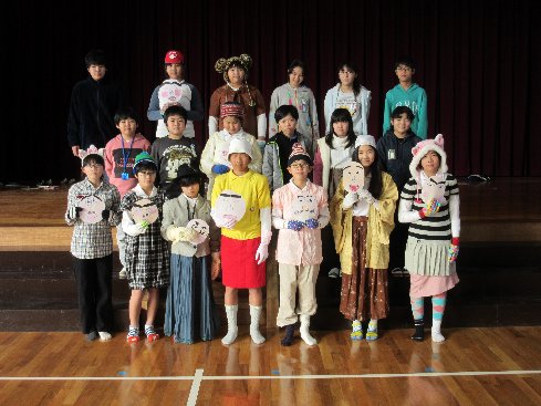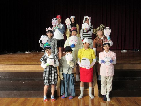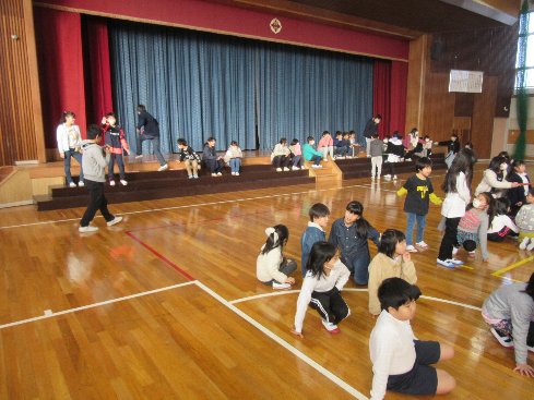今朝の業前は、ふくわらい集会でした。なかまの集会で、一番おもしろいのではないかという集会です。なかま班でペアをつくり、手をつないでパーツを取りに行き、じゃんけんに勝てばパーツがもらえますが、負ければ交代です。いかに早くパーツをそろえてリーダーの仮装を完成させられるかを競います。なかま班で仲良く楽しい会になりました。