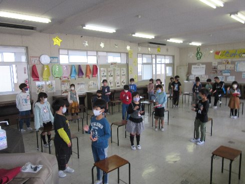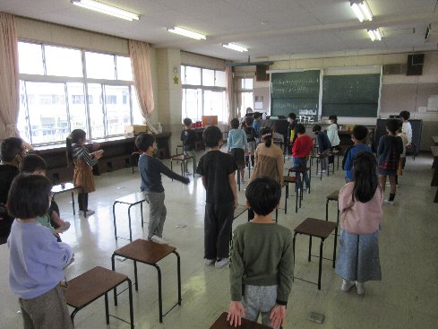 3時間目は音楽の授業でした。「山のポルカ」を歌と打楽器の演奏で表現しました。