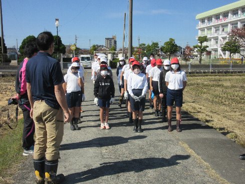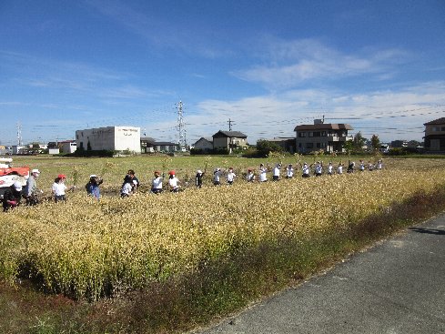 3時間目は稲刈りを行いました。今年は新型コロナウイルス感染症予防のための休校で、田植えの体験はできませんでしたが、せめて稲刈りはということで、実施の運びとなりました。秋晴れの下、とても貴重な体験ができました。