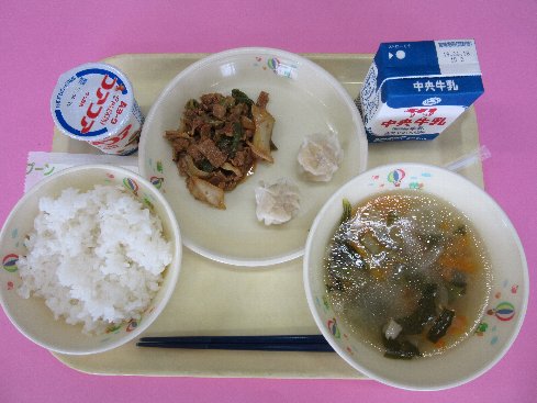 ご飯、牛乳、コーン焼売、回鍋肉、春雨スープ、ヨーグルト