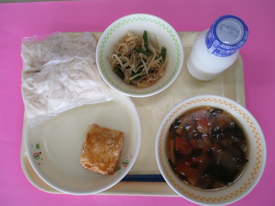 なめし(ご飯)、牛乳、けんちんしのだ、海藻サラダ、新牛蒡のみそ汁