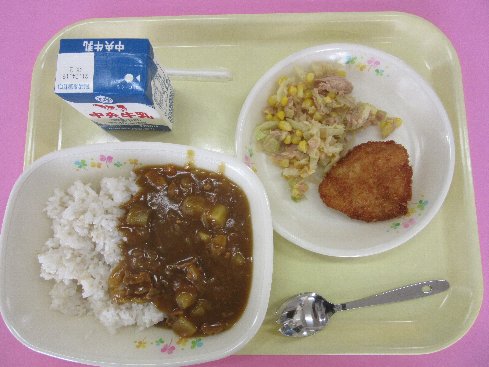 カレーライス(麦御飯)、牛乳、ささみフライ、ツナサラダ
