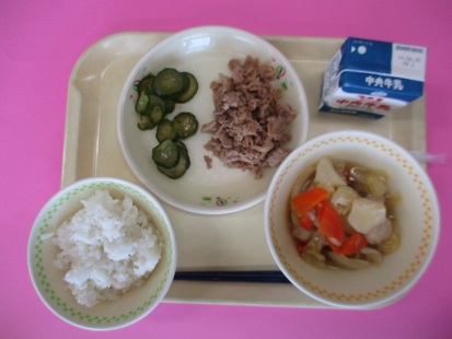 ご飯、牛乳、豚肉の生姜炒め、和風ポトフ、胡瓜の香り付け