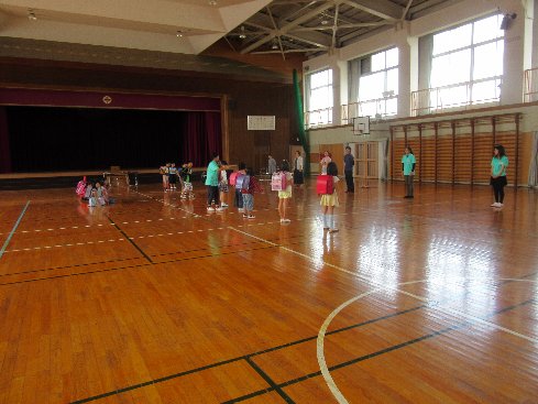 4月11日(水)3時間目は体育の授業でした。体育館で体育の時間の並び方や授業の進め方を確認しながら体を動かしました。