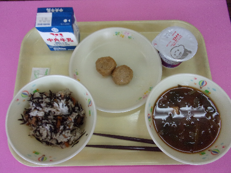 ひじきご飯(ごはん)牛乳、鉄分たっぷりつくね、小松菜の味噌汁、プルーンヨーグルト