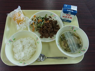 ご飯、牛乳、ビビンバ(肉炒め、ナムル)、中華スープ
