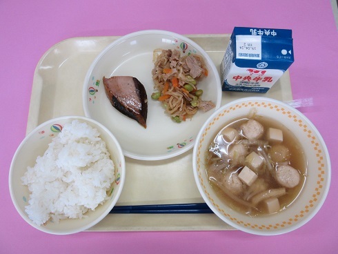 ご飯、牛乳、鰹のおかか煮、切り干し大根の五目炒め、具沢山汁