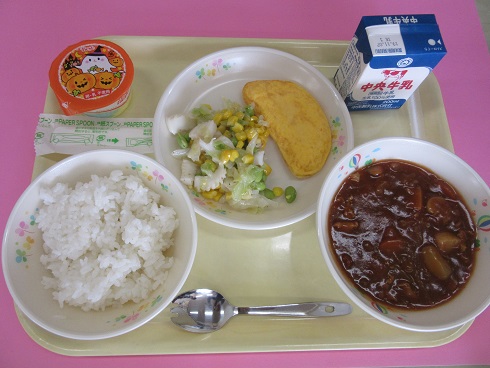 ハヤシライス(ご飯)、牛乳、オムレツ、イタリアンサラダ、パンプキンデザート