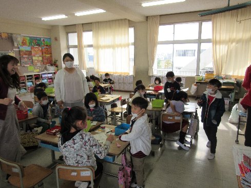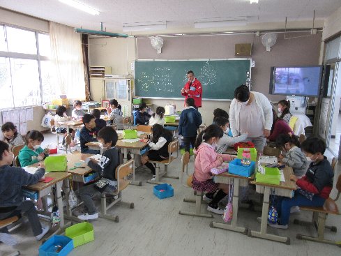 1・2時間目は生活科の授業でした。秋の材料として、ドングリを使って、校長先生も一緒に工作しました。