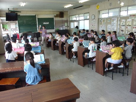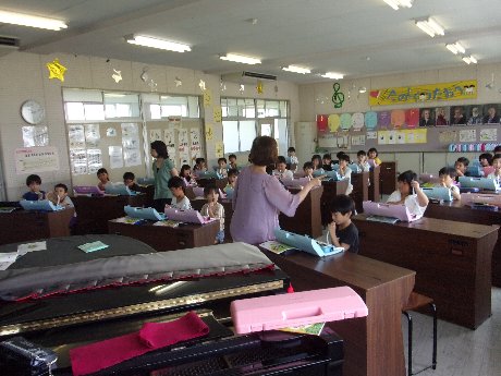 2時間目は音楽の授業でした。鍵盤ハーモニカを実際に吹いて音を出しました。