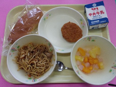 愛知の米粉パン、牛乳、焼きそば、蓮根サンドフライ、イチジクゼリーのフルーツ和え