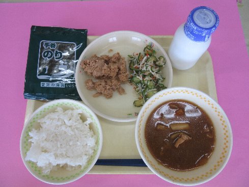 手巻きご飯(ご飯、海苔、ツナそぼろ、かにかまキュウリ)、牛乳、豚汁