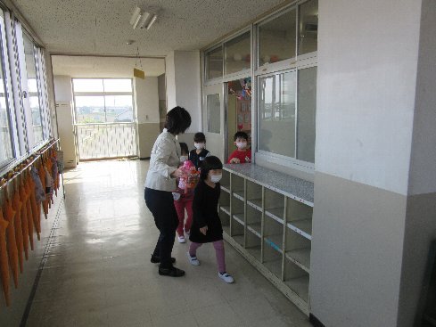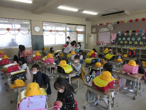 1年生の教室からは元気なあさのあいさつが聞こえてきました。早速、担任の先生から「水筒はここに置くよ」「順番にきてね」という指示に、「はい」という元気な返事ができました。