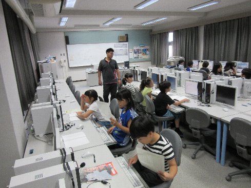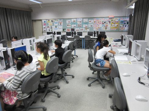 1時間目は国語の授業でした。「新聞を作ろう」ということで、班に分かれて、記事の検討をしたり、コンピュータ室で調べ学習をしました。