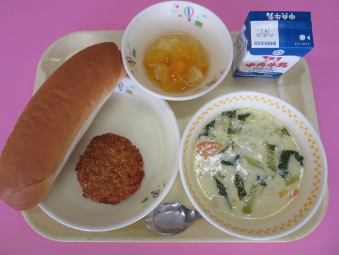 ミルクロールパン、牛乳、笹身カツ、コーンクリームスープ、フルーツ和え