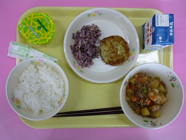 ご飯、牛乳、お好み半平、肉じゃが、紫蘇和え、メロンゼリー
