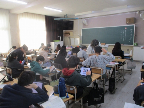 教科書の教材文で学習した表現や文章構成を生かして、一人一人のテーマに沿った文章を考えていました。