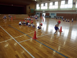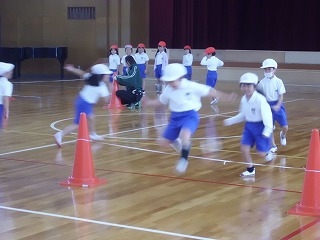 1年生は体育で、コーンにゴムをはってリズムよく跳び越える運動を行いました。