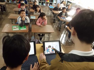 タブレットと大型モニターを使って読み聞かせを行いました。