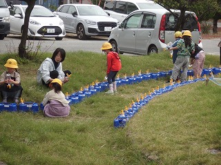 運動場で鏡を使って日光を反射させ、光の進み方を楽しく調べました。